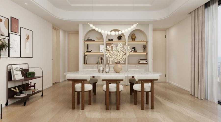 This dining and kitchen design combines the elegant texture of cream style with vintage-inspired details. The space is enveloped in creamy hues that exude soft sophistication. A marble dining table paired with cream-colored chairs showcases a refined contrast between wood textures and smooth finishes, forming an elegant and harmonious scene. Artistic pendant lighting, arched shelving, and vintage ornaments bring subtle layers of creativity and charm. Wall art and movable side tables further enrich the visual rhythm, while touches of greenery infuse life into the soft atmosphere. The natural grain of wooden flooring maintains the creamy warmth while responding to the space through material dialogue, making this dining area a graceful model for modern cream style design.