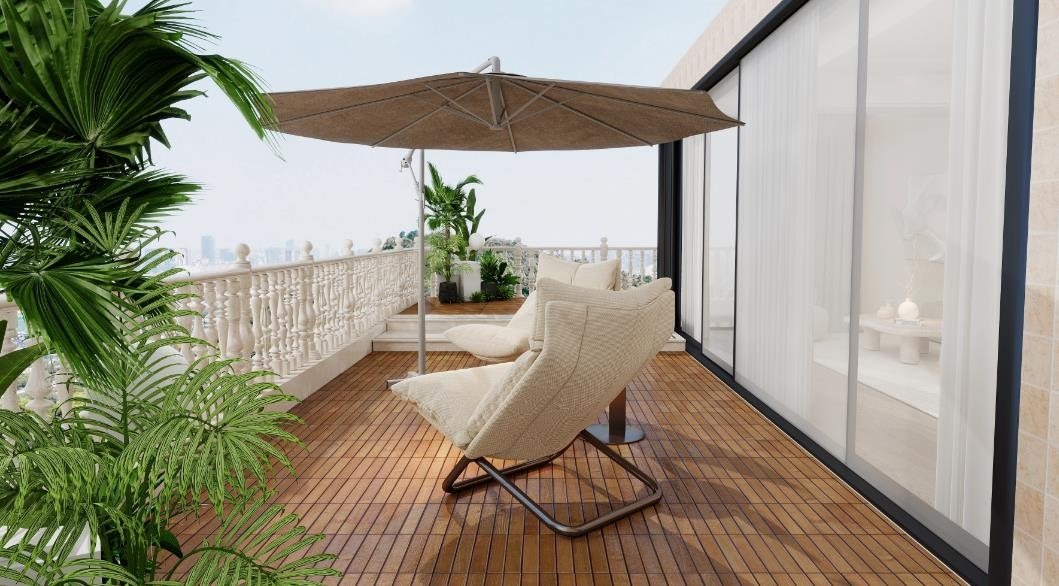 This yard design combines the laid-back elegance of the cream style with the refreshing touch of nature. Cream-colored lounge chairs and a matching umbrella fill the space with a soft, sunlit sense of ease. The natural texture of wooden flooring pairs beautifully with neutral outdoor fabrics, outlining a calm and relaxing atmosphere. Tropical greenery and artistic outdoor furniture reflect thoughtful resort-inspired design. With a panoramic city view flowing into the open interior, the yard maintains the creamy sophistication of the style while embracing an airy, leisurely vibe. It stands as a graceful example of cream style yard design—serene, refined, and full of relaxed vacation charm.