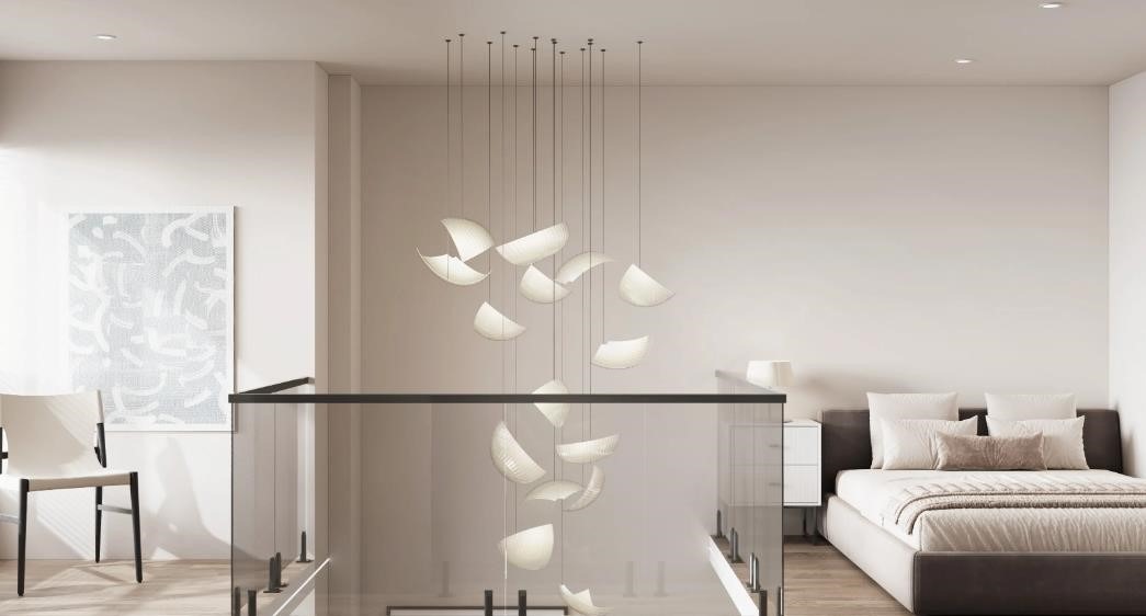 This duplex space infuses creamy tones with refined luxury and artistic flair. From the walls to soft furnishings, every detail radiates smooth sophistication. An artistic chandelier paired with a minimalist bed outlines a gentle yet upscale atmosphere, while the simple chair, abstract artwork, and glass details highlight a sense of balance and creativity. The double-height structure enhances openness and layering, allowing light and warmth to flow naturally. It’s a stylish interpretation of modern elegance—an inspiring direction for duplex interiors seeking both comfort and aesthetic depth.