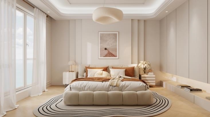 This bedroom blends elegance and practicality through its soothing palette and thoughtful layout. Beige walls and light-gray bedding create a layered visual rhythm that feels calm yet elevated. Minimal furniture, artful decor, and creative lighting reveal quiet sophistication, while the large bay window upholstered in creamy fabric enhances both beauty and usability. The result is a tranquil space that balances warmth, function, and timeless charm—a perfect example of understated modern living.