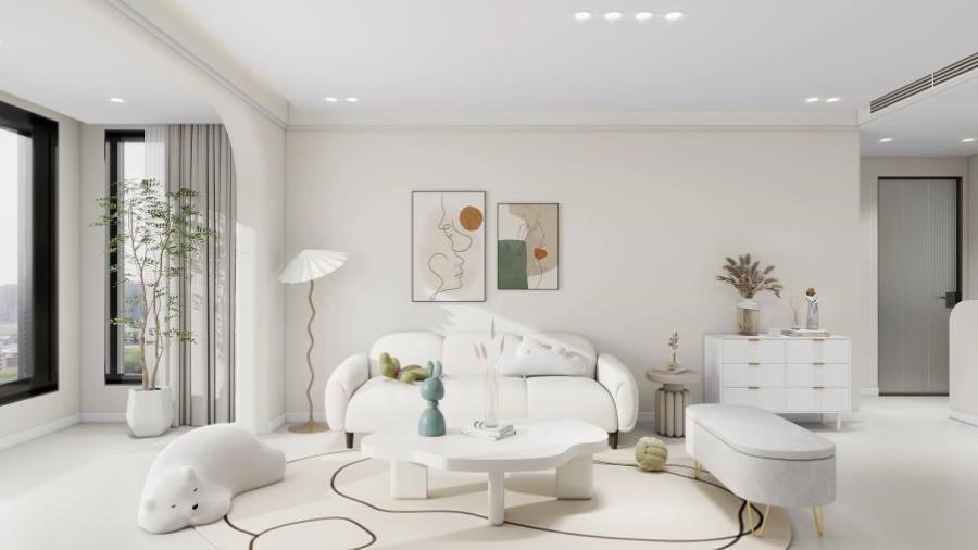 This living room blends gentle cream shades with artistic geometric touches. The delicate tones flow from the furniture to the decor, maintaining a warm and harmonious atmosphere. A plush sofa and textured wall art form a soothing visual center, creating an airy sense of art and balance. The geometric rug, rounded coffee table, and playful ornaments introduce rhythm and depth to the space. Though unified in tone, the room feels far from monotonous—light and shadow dance across surfaces, giving the living area an elegant, serene, and artful character.